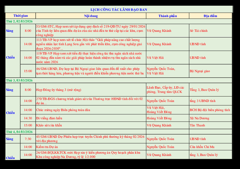 | Tiêu đề văn bản | Lịch công tác lãnh đạo Ban tuần 10/2026 | ||