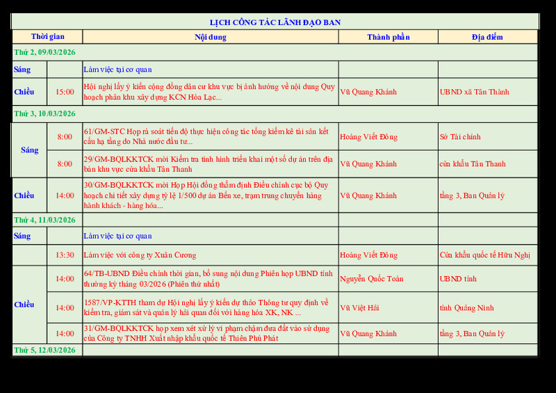 | Tiêu đề văn bản | Lịch công tác lãnh đạo Ban tuần 11/2026 | ||