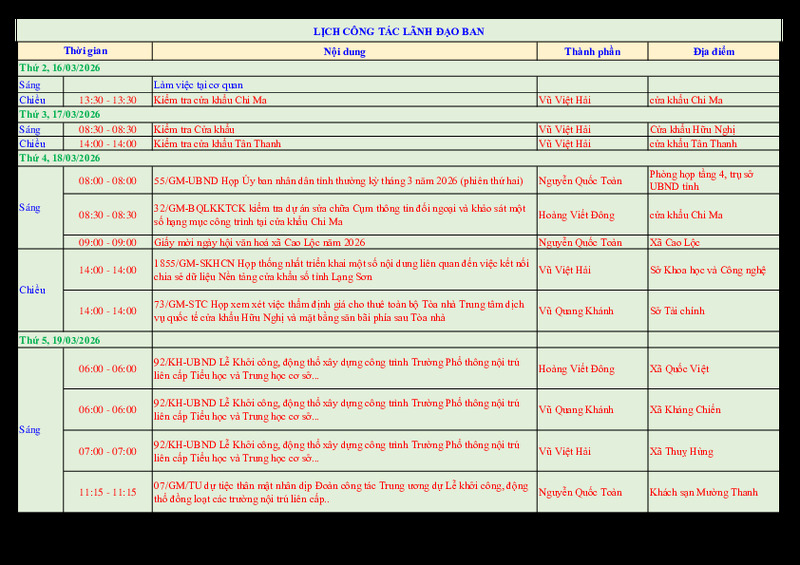 | Tiêu đề văn bản | Lịch công tác lãnh đạo Ban tuần 12/2026 | ||