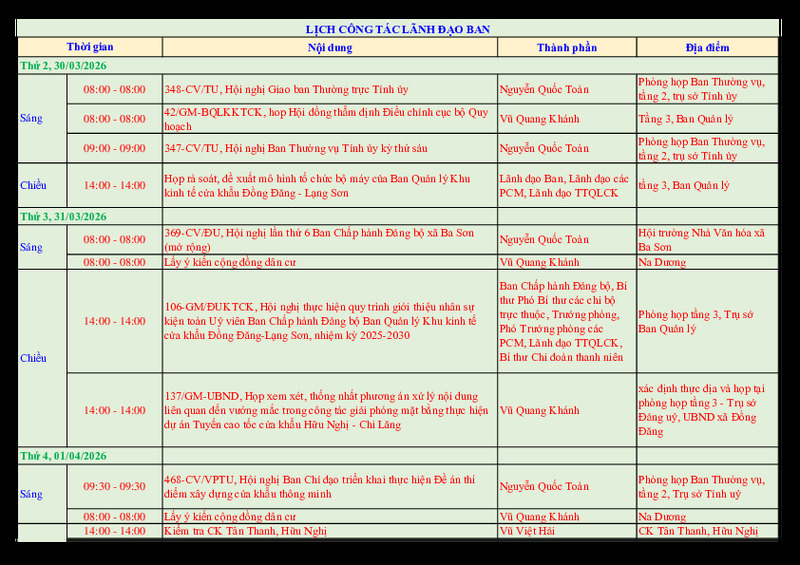 | Tiêu đề văn bản | Lịch công tác lãnh đạo Ban tuần 14/2026 | ||
