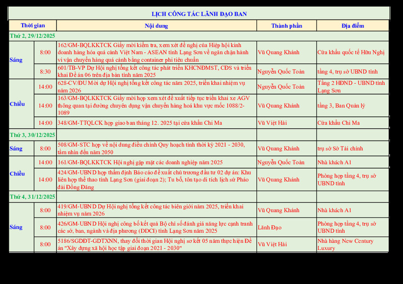 | Tiêu đề văn bản | Lịch công tác lãnh đạo Ban tuần 53 | ||