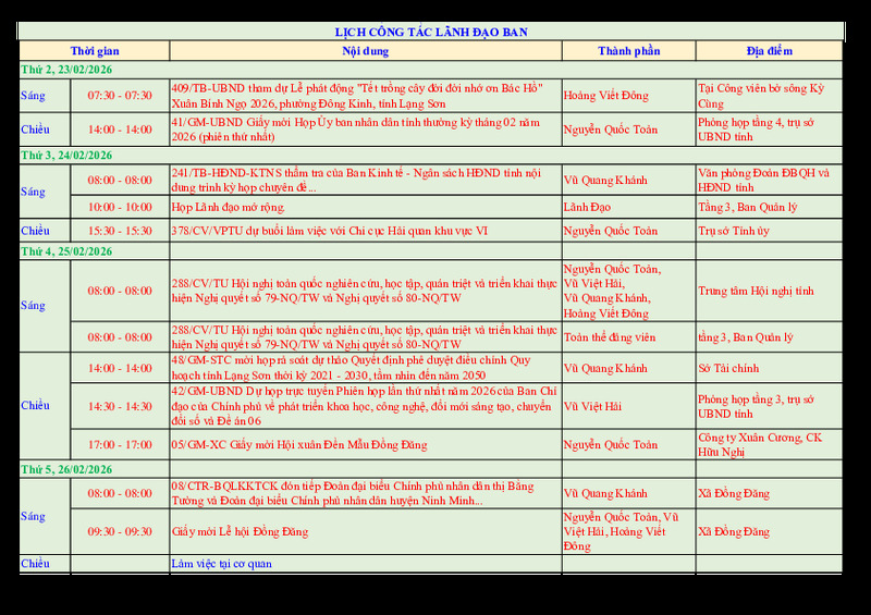 | Tiêu đề văn bản | Lịch công tác lãnh đạo Ban tuần 9/2026 | ||