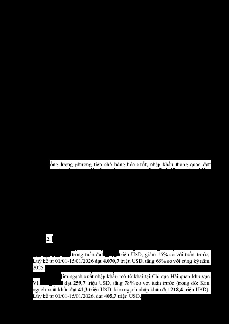 | Tiêu đề văn bản | Báo cáo tuần (từ ngày 09/01-15/01/2026) tình hình xuất nhập khẩu hàng hóa qua các cửa khẩu trên địa bàn tỉnh | ||