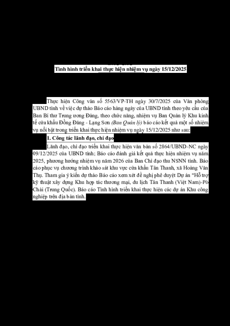 Trong ngày, hoạt động thông quan hàng hoá xuất nhập khẩu diễn ra bình thường. Triển khai thí điểm thực hiện phương thức vận chuyển hàng hoá hai chiều tại các lối thông quan, đường chuyên dụng vận chuyển hàng hoá thuộc cửa khẩu quốc tế Hữu Nghị. Có 01 phương tiện Việt Nam vận chuyển hàng hoá hai chiều tại cửa khẩu quốc tế Hữu Nghị. Tại đường chuyên dụng vận chuyển hàng hoá khu vực mốc 1088/2-1089 Tân Thanh và lối thông quan Cốc Nam không phát sinh phương tiện vận chuyển hàng hoá hai chiều. Tổng số phương tiện chở hàng xuất, nhập khẩu trong ngày: 1.439 xe (luỹ kế từ ngày 01/01/2025 đến hết ngày 15/12/2025 đạt 536.883 xe), trong đó: