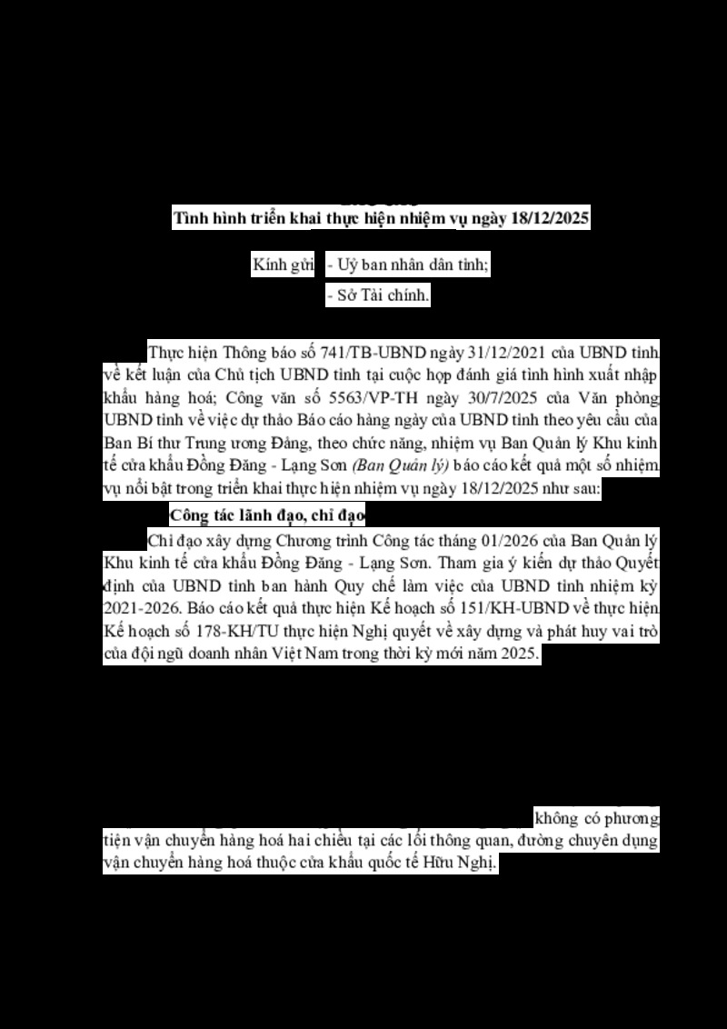 Nhìn chung tình hình xuất nhập khẩu hàng hoá tại các cửa khẩu trên địa bàn tỉnh trong ngày diễn ra bình thường, lưu lượng phương tiện chở hàng hoá xuất nhập khẩu giảm 08 xe so với ngày 17/12/2025, không có yếu tố đột biến, bất thường. Lượng phương tiện chở hàng hoá xuất khẩu hằng ngày lưu tại khu vực cửa khẩu ở trạng thái bình thường; các bến bãi hoạt động ổn định, đáp ứng tốt yêu cầu thông quan xuất nhập khẩu hàng hoá. Trong ngày, không có phương tiện vận chuyển hàng hoá hai chiều tại các lối thông quan, đường chuyên dụng vận chuyển hàng hoá thuộc cửa khẩu quốc tế Hữu Nghị.