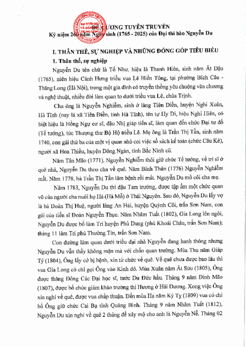 | Tiêu đề văn bản | Tuyên truyền, triển khai các hoạt động kỷ niệm 260 năm Ngày sinh của Đại thi hào Nguyễn Du (1765 - 2025) | ||