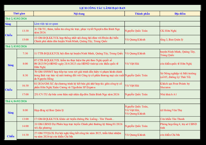 | Tiêu đề văn bản | Lịch công tác lãnh đạo Ban tuần 06/2026 | ||