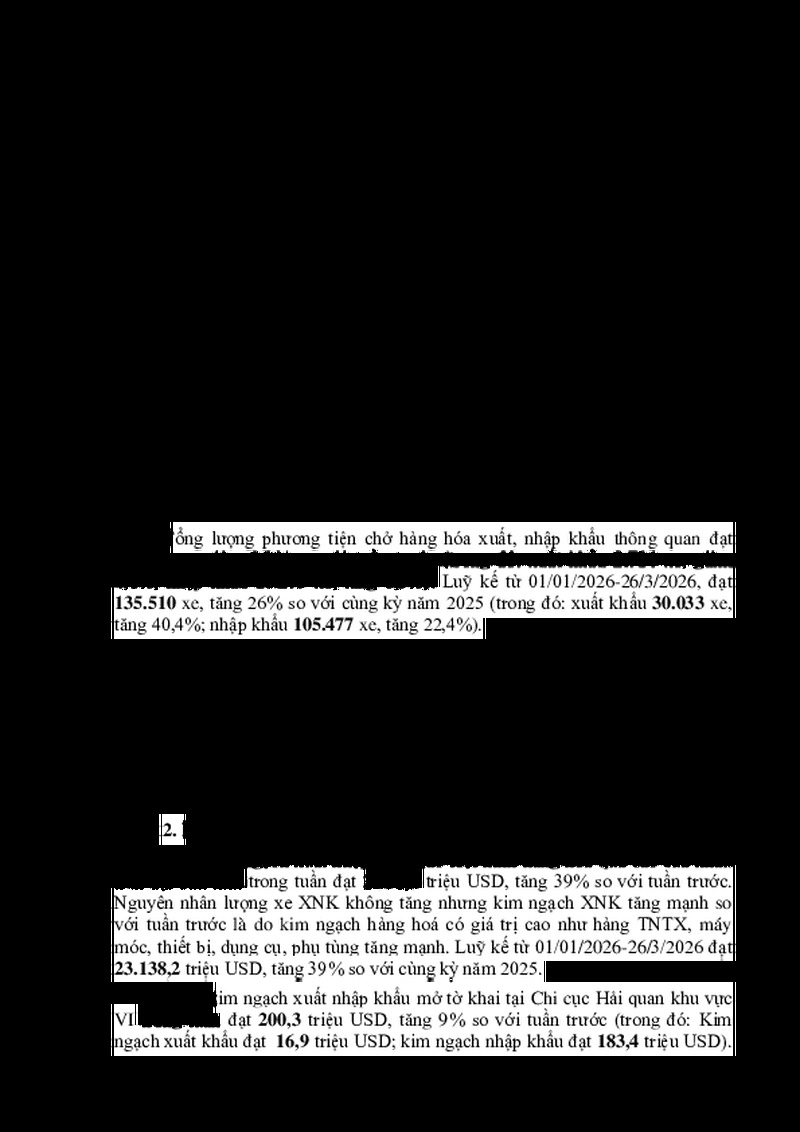 | Tiêu đề văn bản | Báo cáo tuần (từ ngày 20/3/2026-26/3/2026) tình hình xuất nhập khẩu hàng hóa qua các cửa khẩu trên địa bàn tỉnh | ||