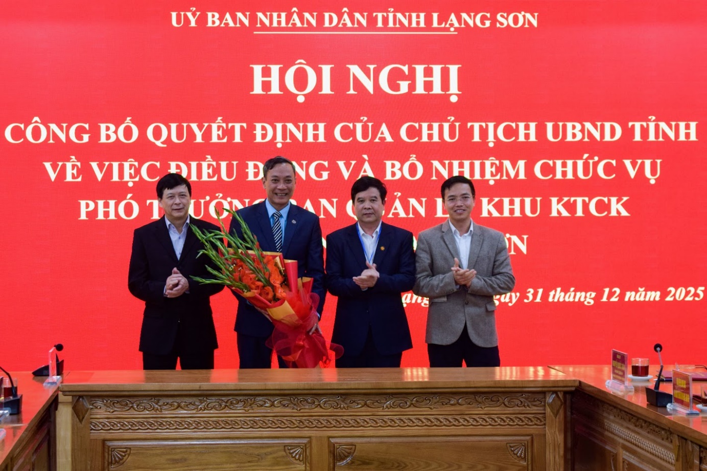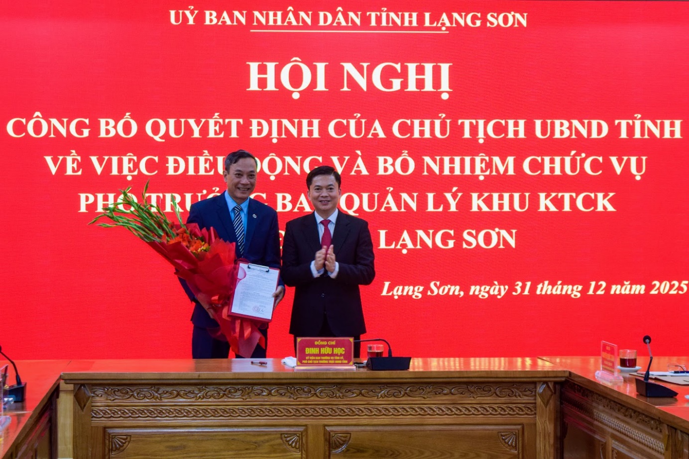 Chiều ngày 31/12/2025, Sở Nội vụ phối hợp với các đơn vị liên quan tổ chức hội nghị công bố Quyết định của Chủ tịch UBND tỉnh về việc điều động và bổ nhiệm chức vụ Phó Trưởng Ban Quản lý Khu Kinh tế cửa khẩu Đồng Đăng - Lạng Sơn. Tới dự, trao Quyết định, phát biểu giao nhiệm vụ cho tập thể và cá nhân có đồng chí Đinh Hữu Học, Ủy viên Ban Thường vụ Tỉnh ủy, Phó Chủ tịch Thường trực UBND tỉnh.